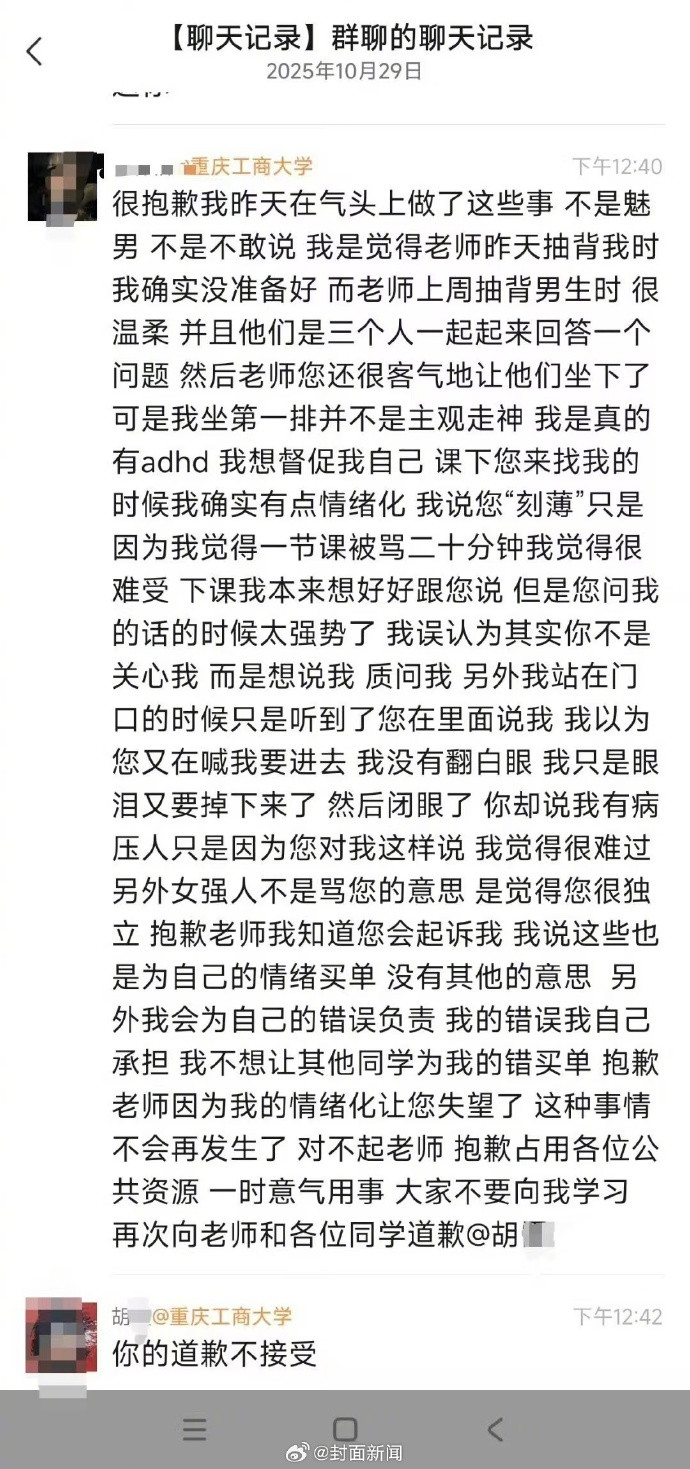 随后,李某在群聊中紧急道歉:“很抱歉,我昨天在气头上,做了这些事。”李某解释吐槽缘由是上课抽背未做好准备,且觉得胡老师上周对抽背的男生态度温和,自己却被老师批评了20分钟,感到十分难堪。对于李某的道歉,胡老师回应称“你的道歉我不接受”“道歉这么容易,要法律干嘛”。