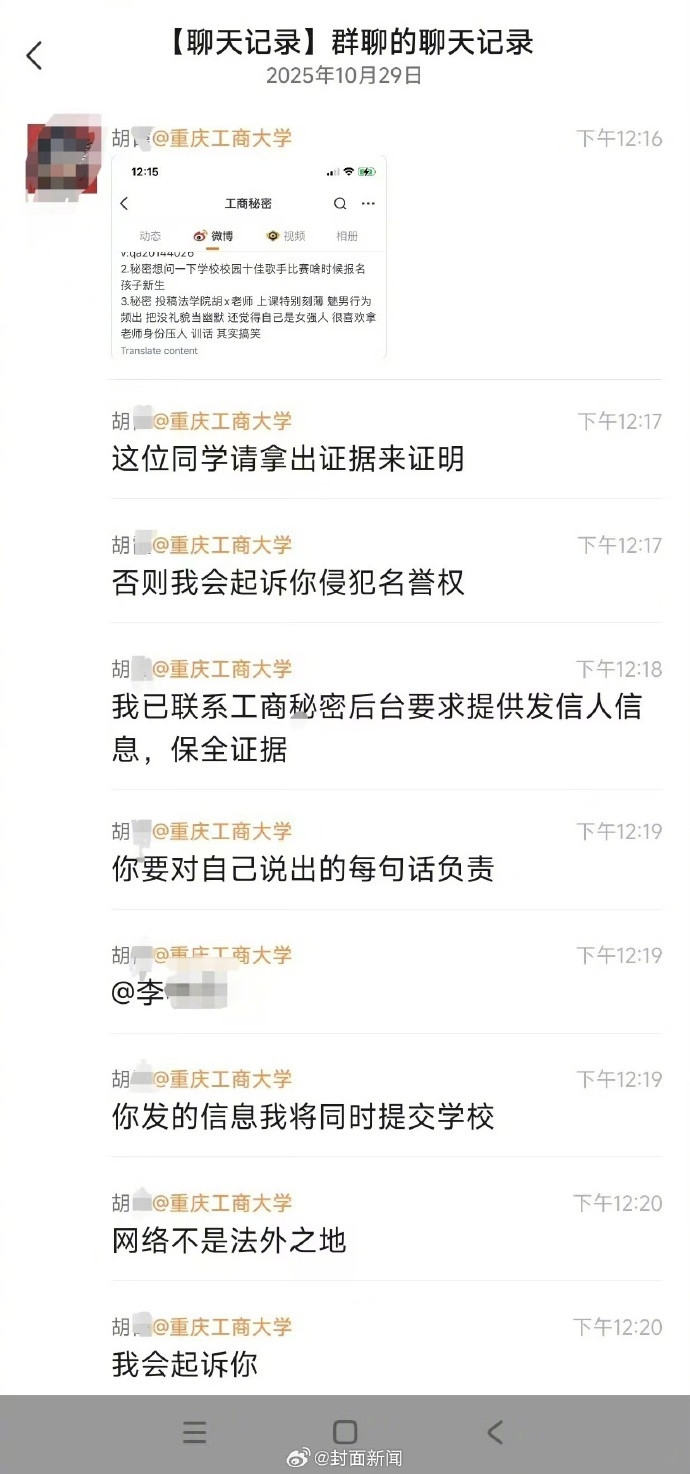 随后,涉事的重庆工商大学法学与社会学学院胡老师在微信群里发出该指控,并回应,“这位同学请拿出证据来证明,否则我会起诉你侵犯名誉权,我已联系工商秘密后台要求提供发信人信息,保全证据。”胡老师还隔空喊话学生,“你要对自己说出的每句话负责”“网络不是法外之地,我会起诉你”。胡姓教师明确表示,“回重庆第一件事就是去南岸区法院起诉”,并多次“艾特”疑似投稿的学生李某。